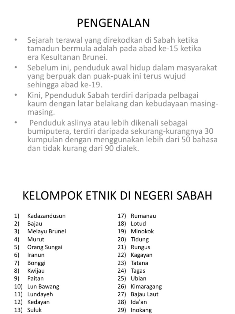 Suku kaum Murut merupakan kaum ketiga terbesar di Sabah yang tinggal di pedalaman dan kawasan tenggara Sabah. Fakta mengenai SabahNegeri di Bawah Bayu Sabah adalah negeri kedua terbesar di Malaysia yang terdiri daripada 13 negeri dan 3 wilayah persekutuan. Kadazan atau Dusun merupakan kaum bumiputra terbesar di negeri Sabah.